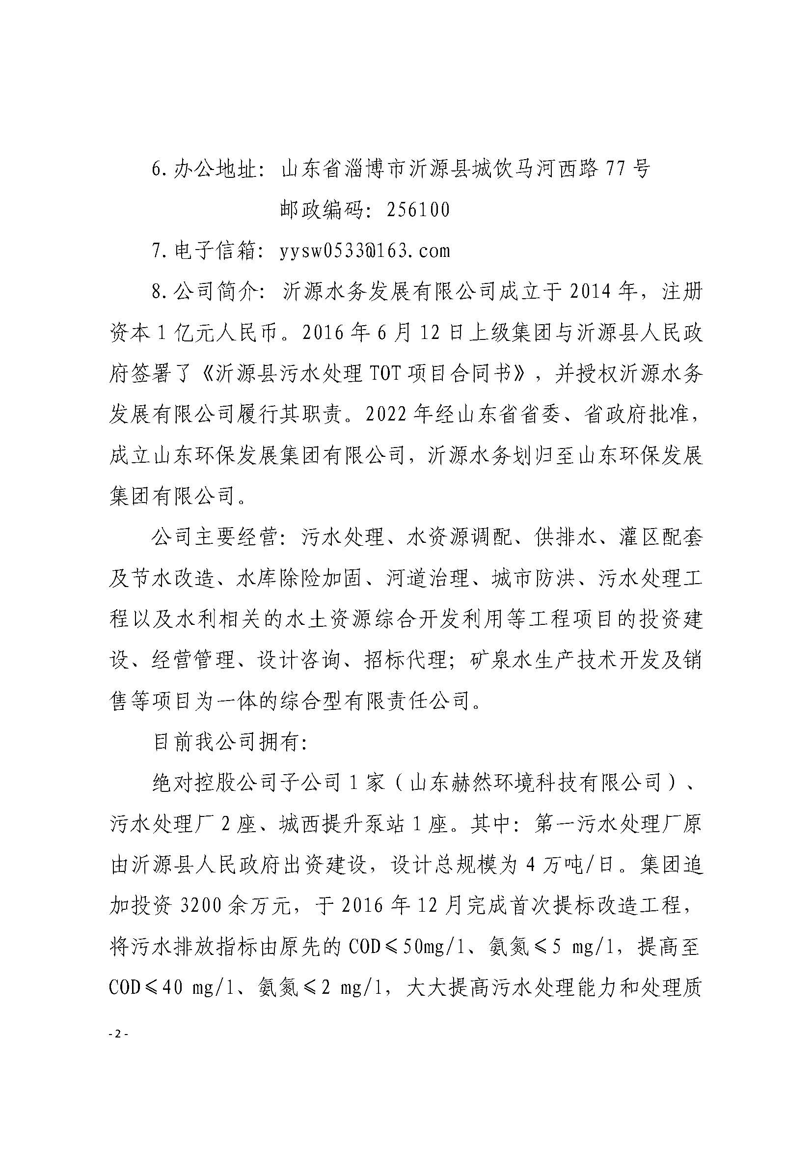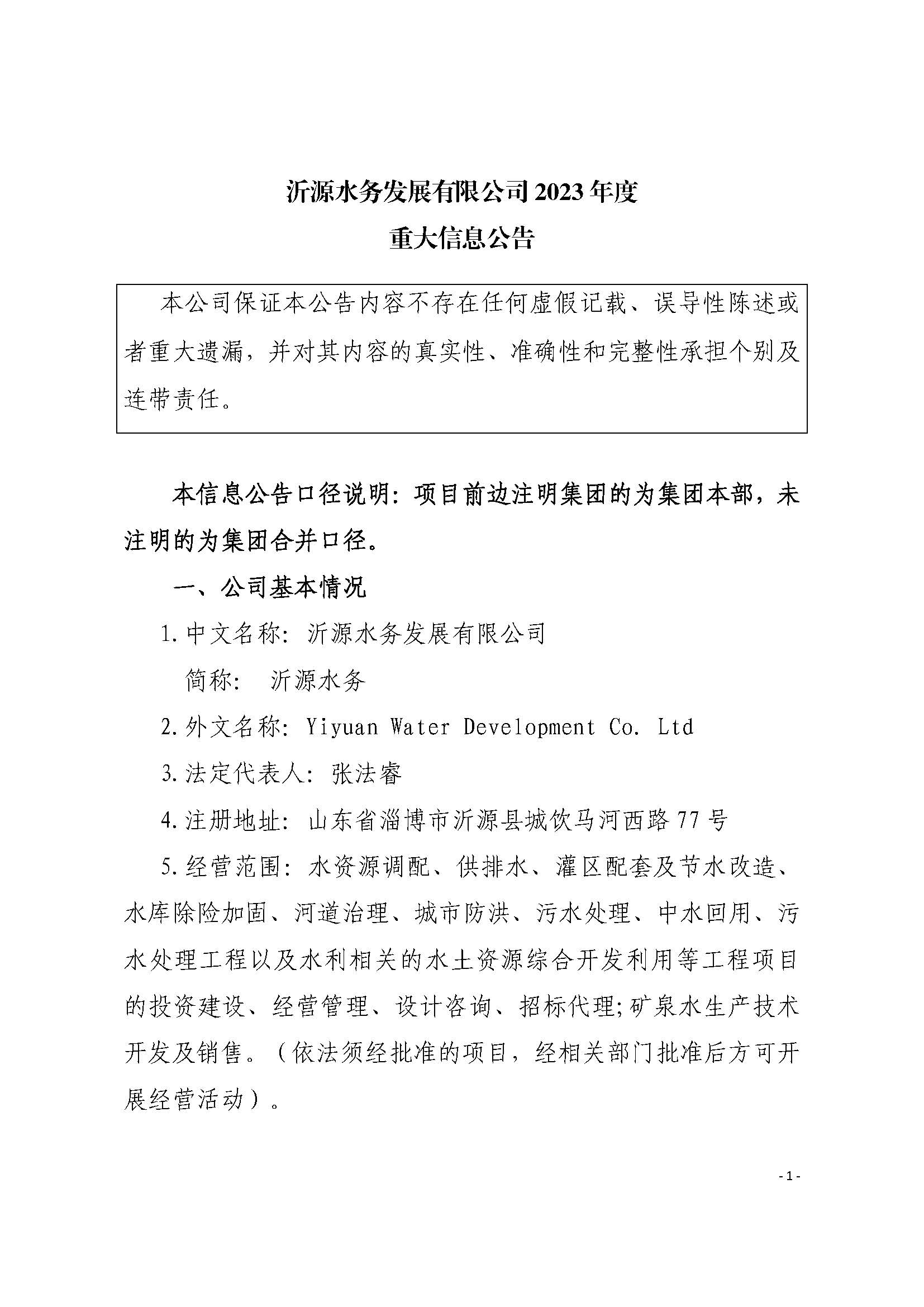 沂源水务发展有限公司2023年度重大信息公告
