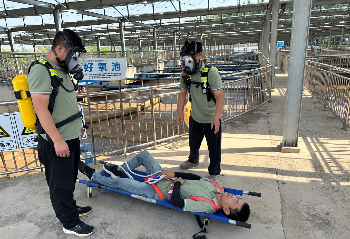 沂源水务积极组织职工开展防汛综合演练。真实模拟突降暴雨,污水处理系统水位上涨,运行人员意外失足落水等危机情况。演练中,工作人员及时调整各工段工艺运行参数,密切关注积水液位并随时准备开启强排水泵,防止大水漫灌厂区,用潜水泵将漫灌厂区的雨水抽入排水管道,确保生产安全运行;同时通讯联络队第一时间联系急救中心,及时将“失足落水人员”安全救出,治安警戒队实施现场警戒,并引导120救护车进入现场。通过演练进一步提高了职工应对汛情的处置水平,增强了防汛实战能力。